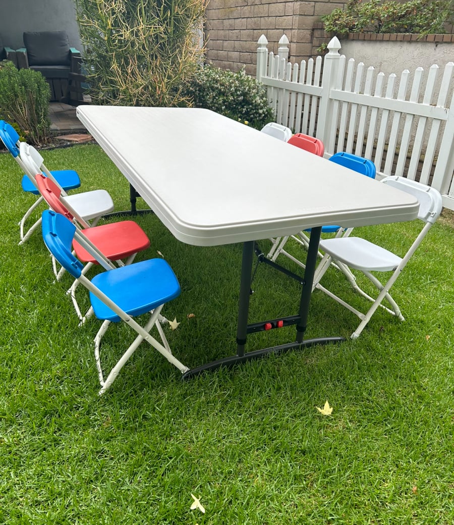 Make your kids table fun with our kids 6ft table and 10 chairs! Perfect for playdates, parties, arts and crafts, or just everyday activities. We have 2 sets of tables and chairs for rent.